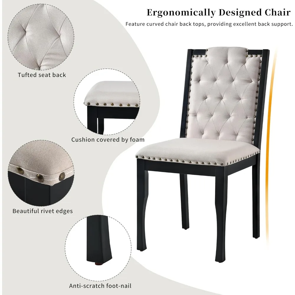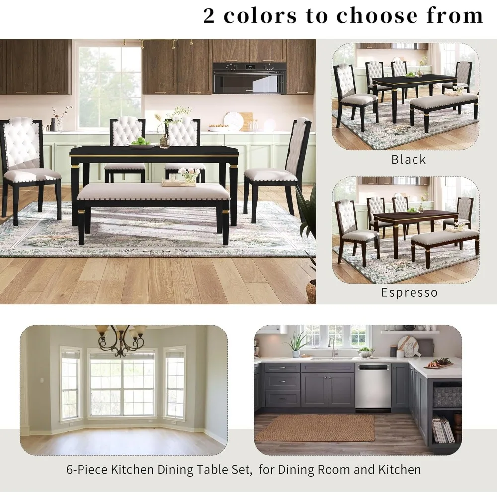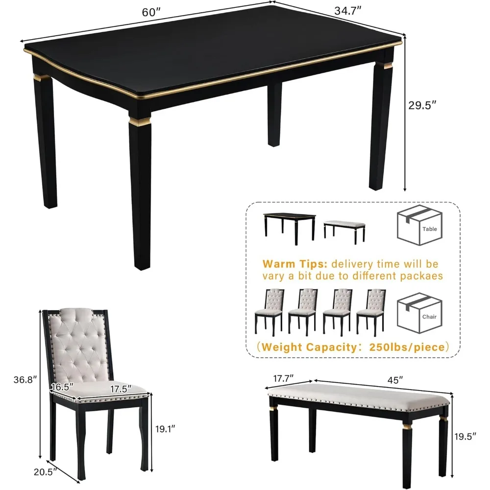 This 6-piece solid wood dining table set includes a 60″ rectangular table, four high-back tufted upholstered chairs, and one matching bench. Designed with a modern yet elegant touch, it offers both comfort and durability—perfect for family meals, gatherings, or formal dining spaces.