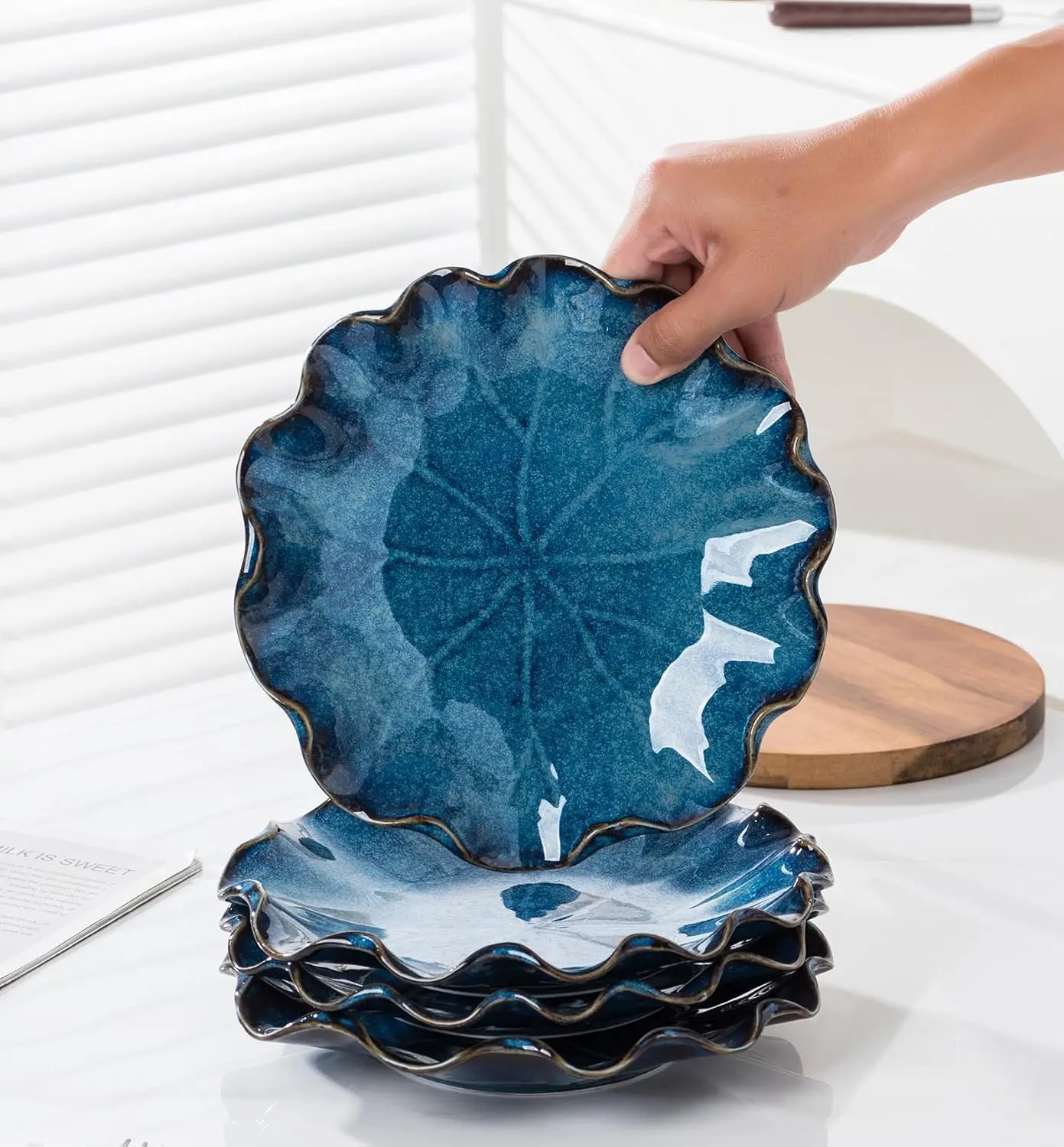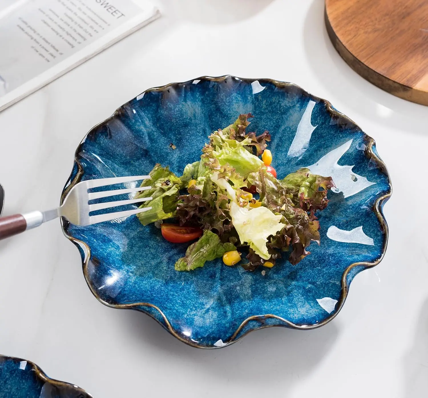 8.5-inch ceramic dinner plates and large shallow serving bowls set for 4. Stackable and versatile, ideal for serving salads, pasta, and everyday meals.