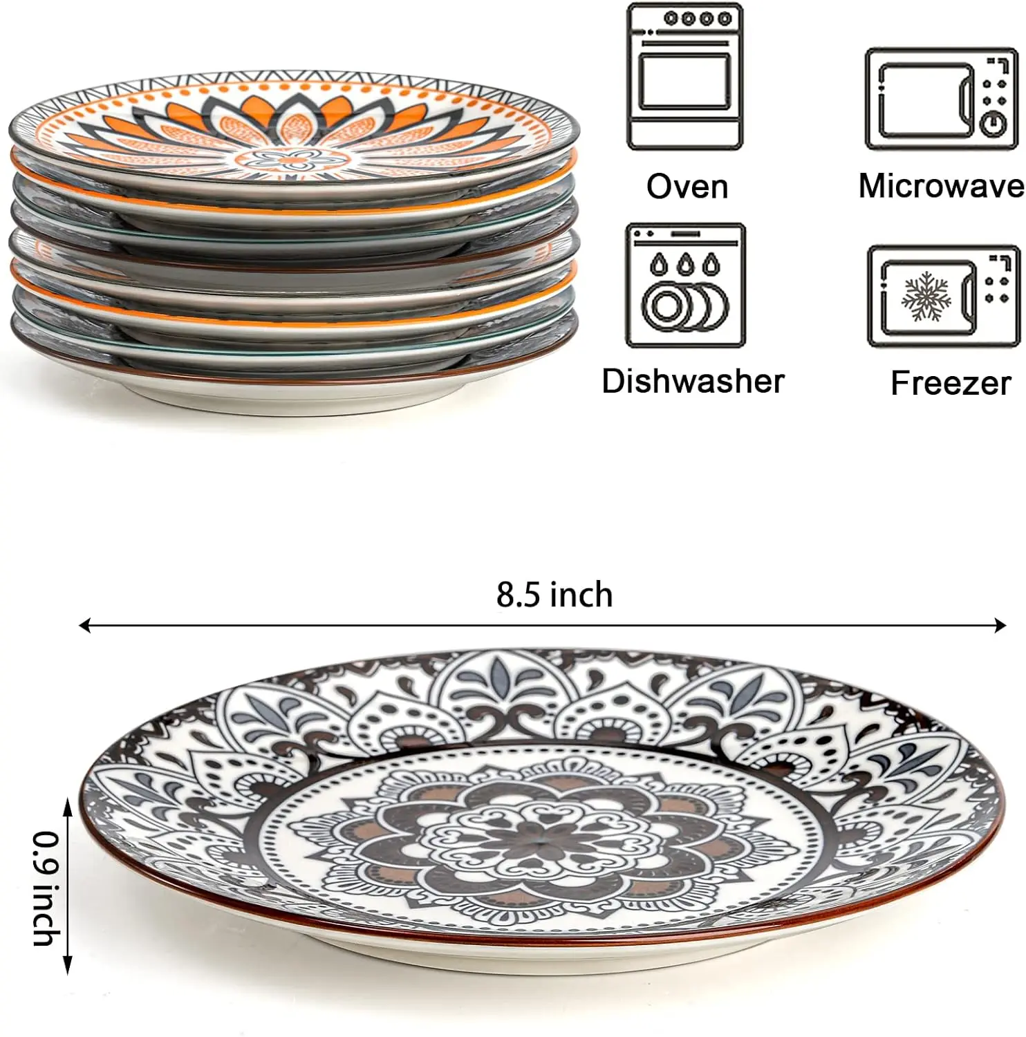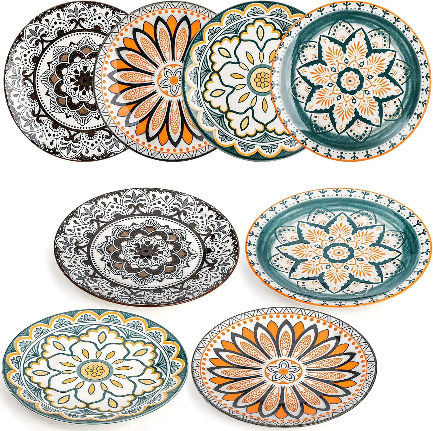 — 8-piece 8.5-inch porcelain salad and dessert plates with colorful floral designs. Perfect for serving appetizers, salads, fruits, or snacks in style.