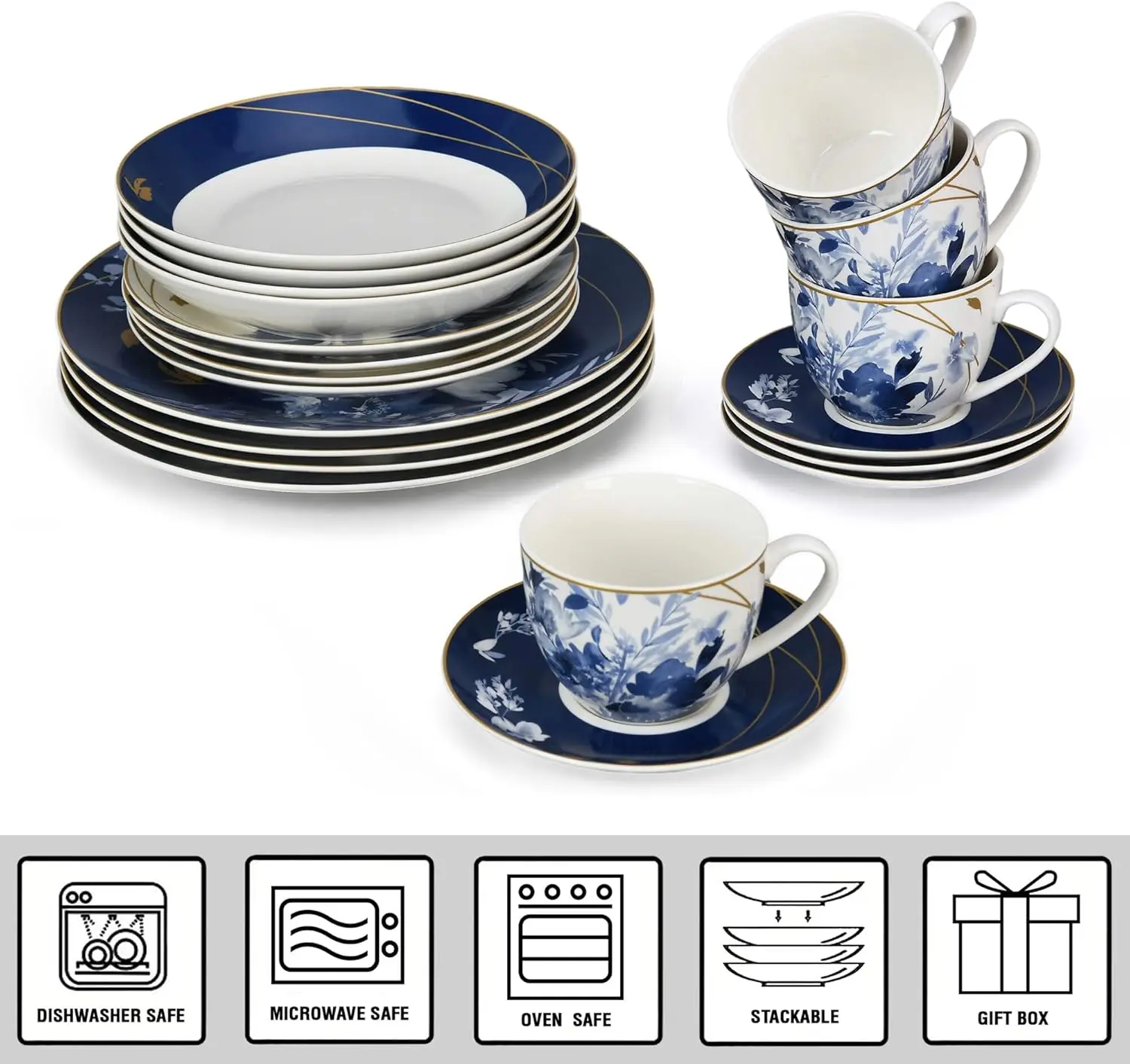 Handmade bone china dinnerware set for 4, featuring 20 pieces of plates, bowls, and dishes with a durable reactive glaze finish. Chip- and scratch-resistant, oven-safe, and perfect for everyday dining or special occasions.