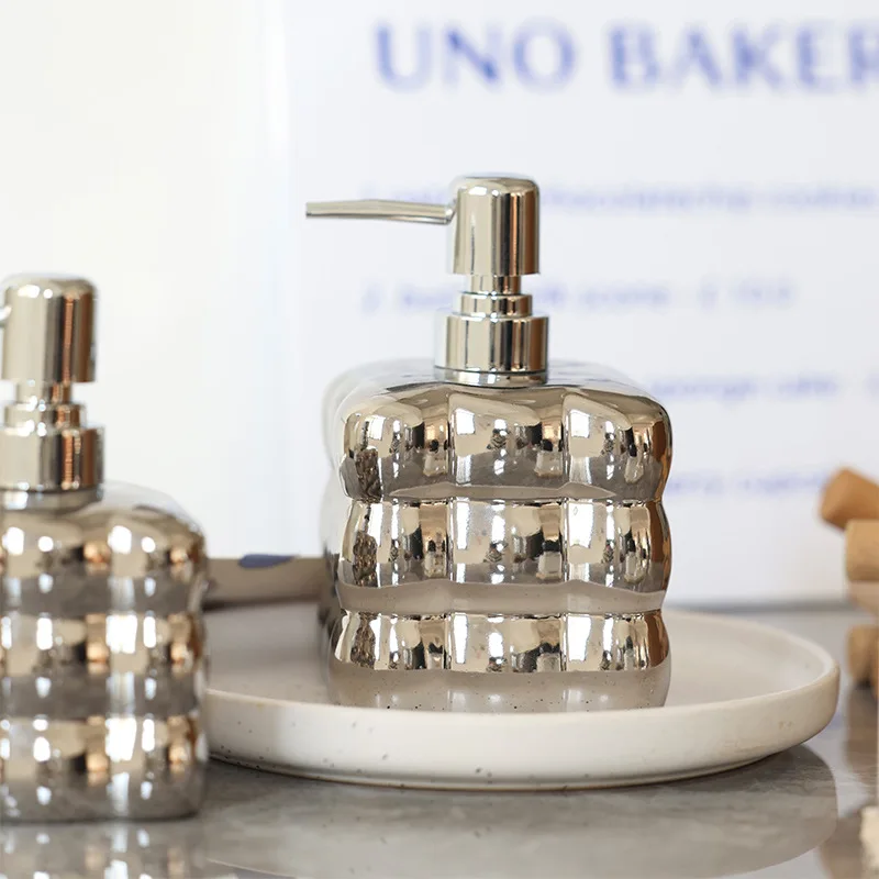 Stylish ceramic press-type dispenser for lotion, shampoo, shower gel, or hand sanitizer. Elegant design adds a touch of sophistication to any bathroom. Refillable and perfect for home use.