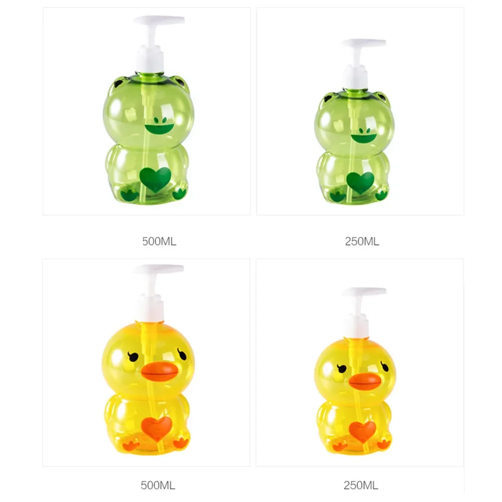 Portable frog- or duck-shaped soap dispenser for kids. Press-type pump dispenses shampoo, shower gel, or liquid soap. Available in 250ml or 500ml, adding a fun and functional touch to bathrooms.