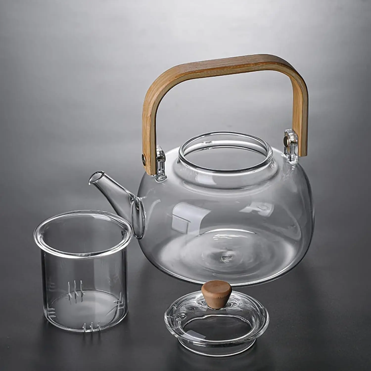 900ml clear glass teapot with removable infuser, suitable for stovetop use and loose tea brewing. Stylish and practical, perfect as a gift or everyday tea preparation.