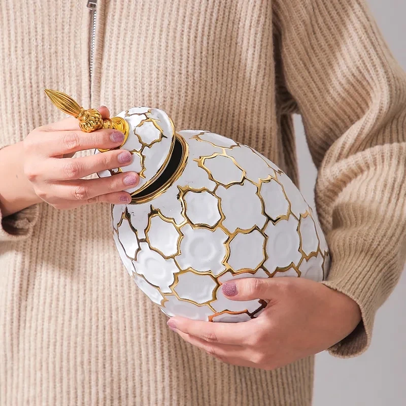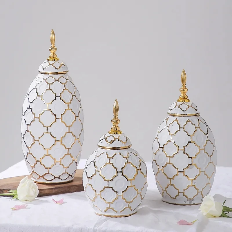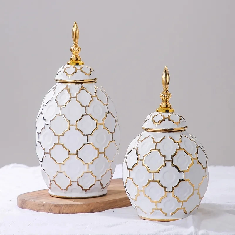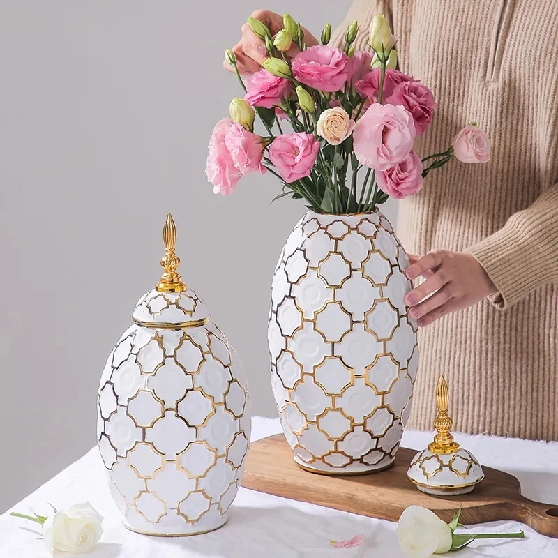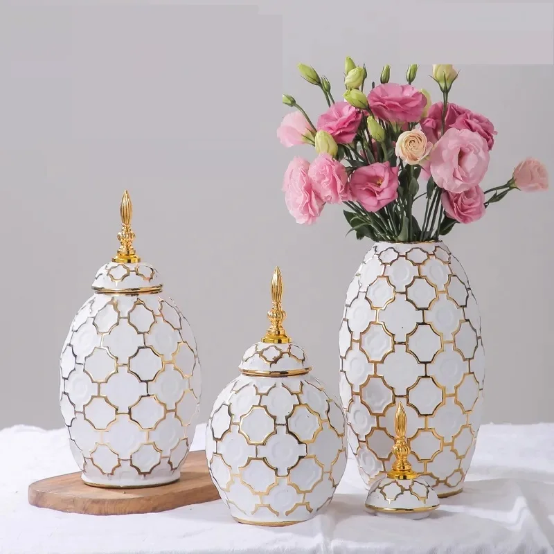 Luxury gold plaid electroplated ceramic vase — ideal for dry flowers, home décor, hotel displays, or as a decorative storage jar.