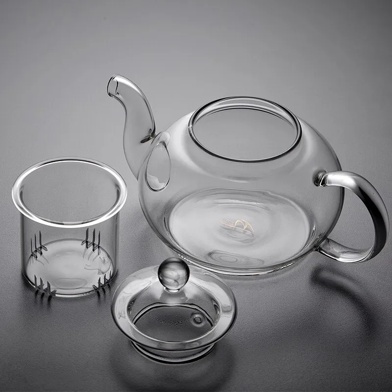 Heat-resistant glass tea pot set with built-in strainer/infuser, ideal for brewing puer, oolong, or barley tea. Available in 400ml and 1000ml, perfect for kung fu tea preparation and everyday tea enjoyment.