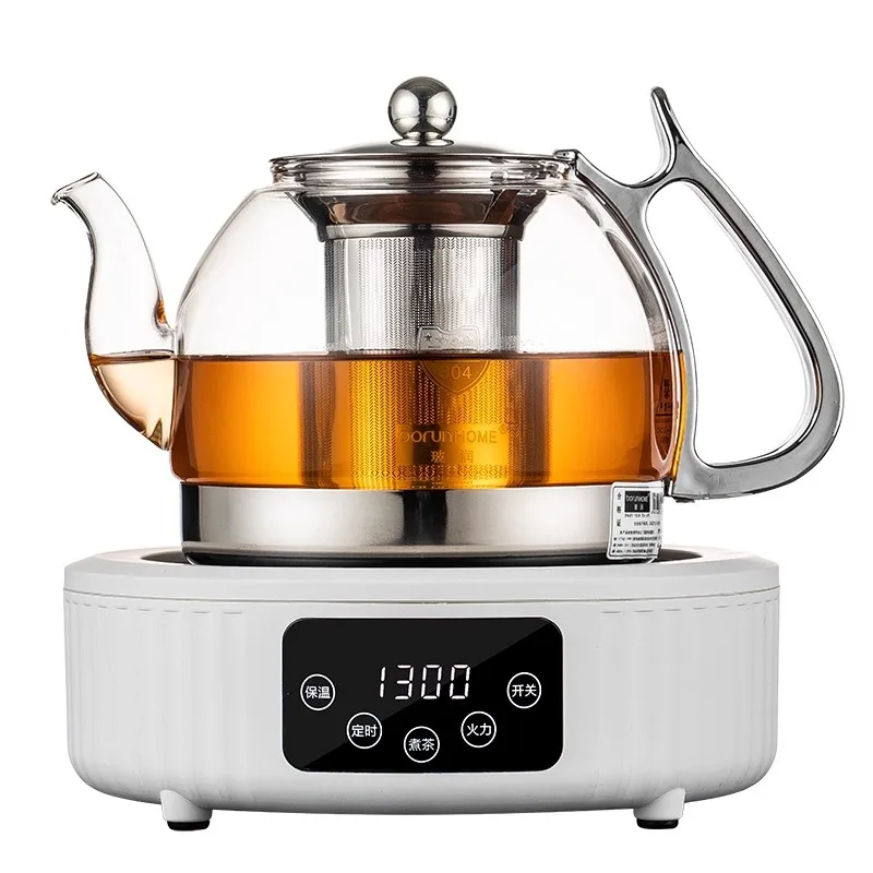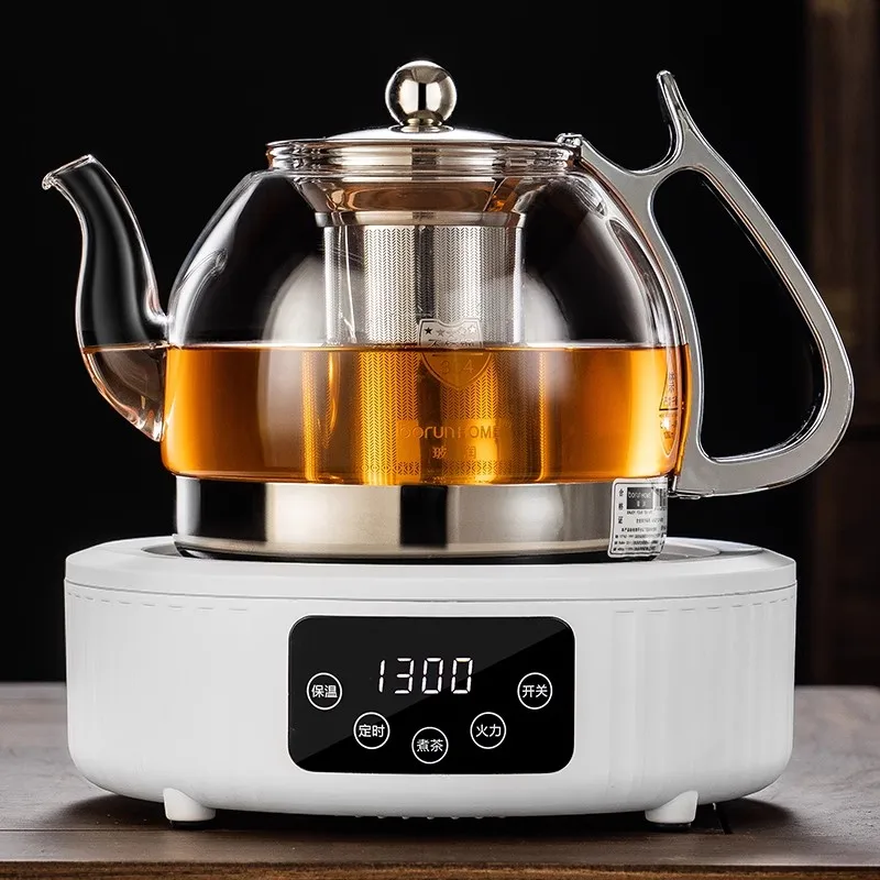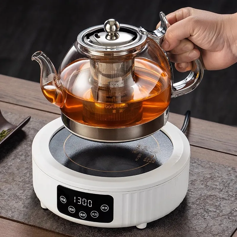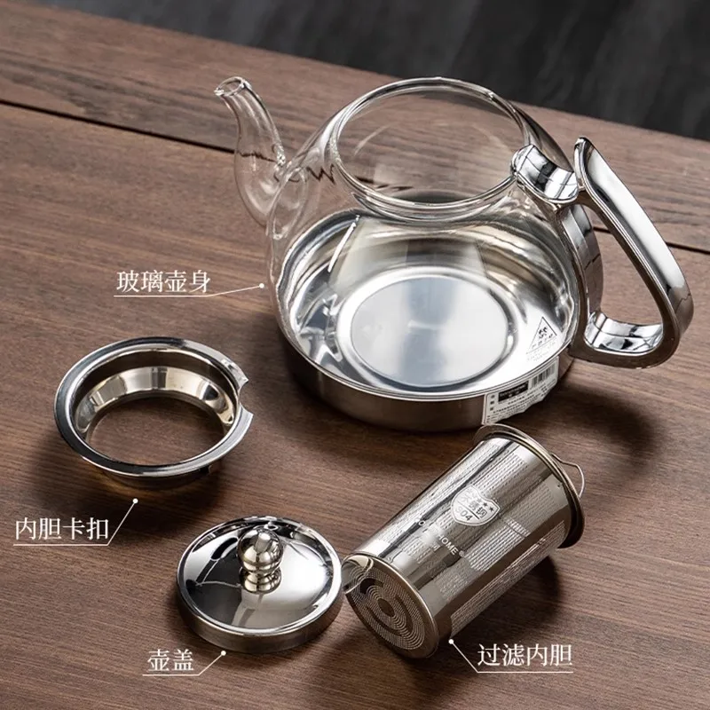 Glass tea pot with stainless steel liner, specially designed for induction cookers. Perfect for boiling and brewing flower tea with durability and style.