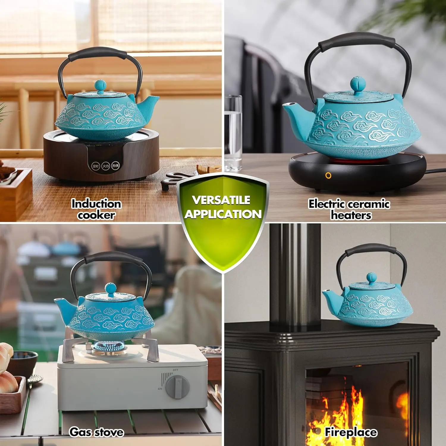 Japanese-style cast iron teapot with enameled interior and built-in infuser for loose leaf tea. Stovetop safe, durable, and elegantly designed with a clouds pattern for everyday tea brewing or gifting.