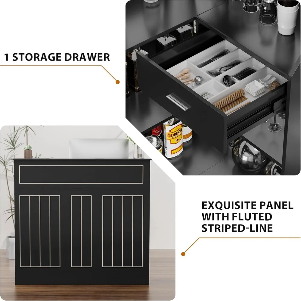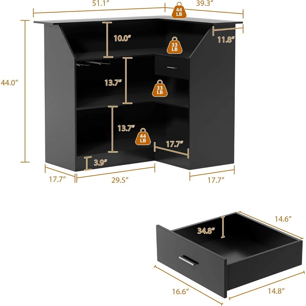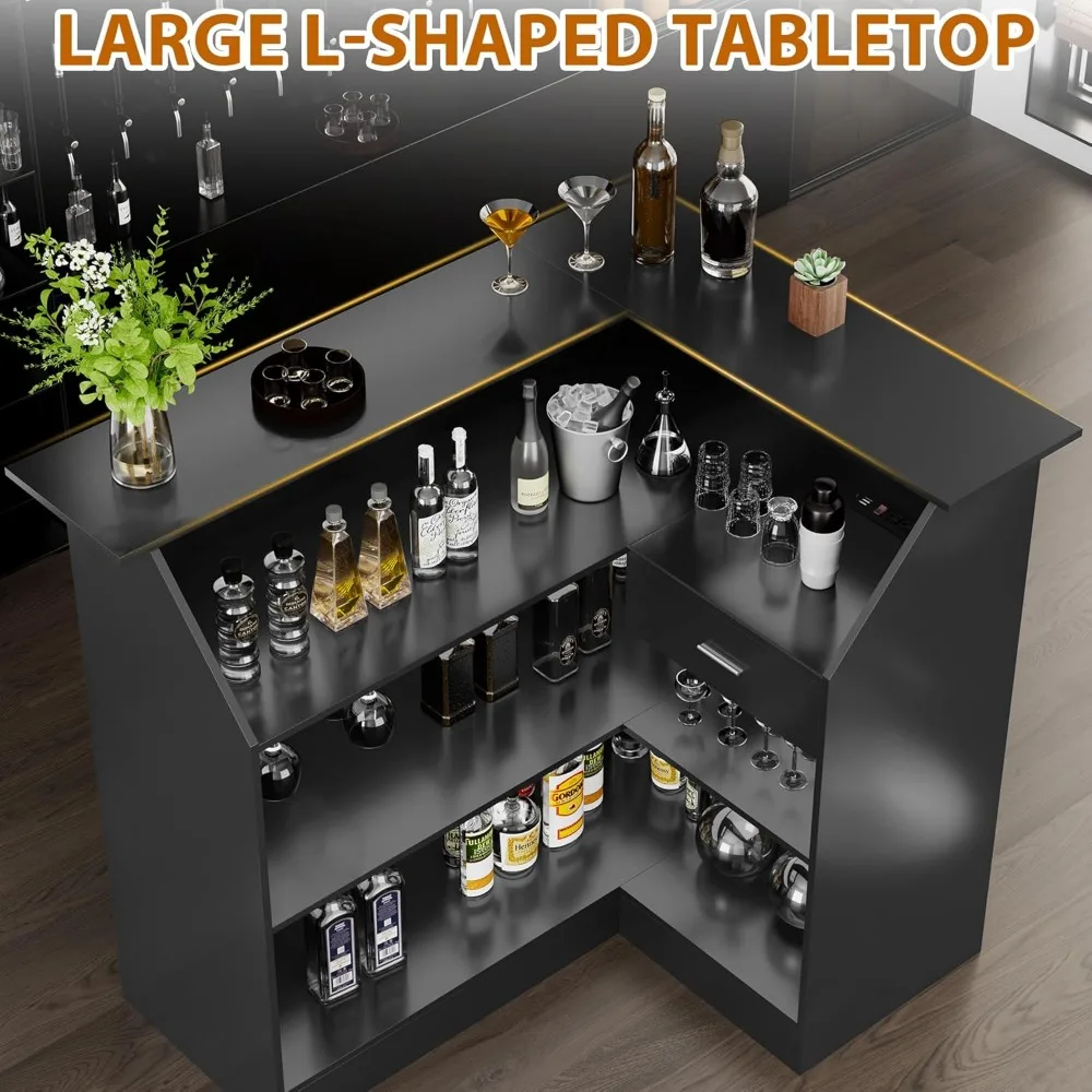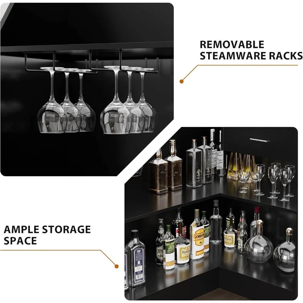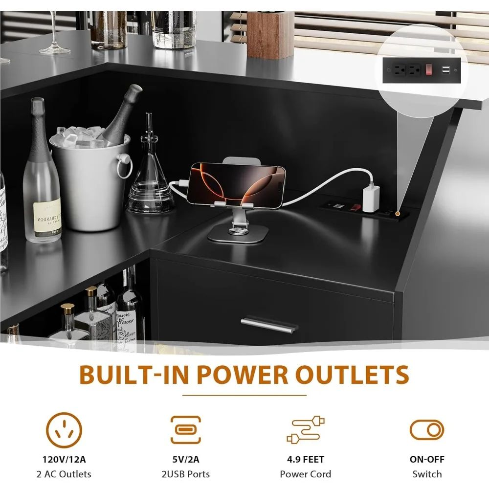 Maximize your corner space with this L-Shaped Home Bar Cabinet featuring a power outlet, 4-tier storage shelves, a drawer, and a wine glass holder. Perfect for storing liquor, wine, glassware, and bar accessories, this corner unit combines functionality with a modern design. Ideal for kitchens, dining rooms, or home bars, it keeps everything organized and within reach while offering a stylish setup for entertaining family and friends.