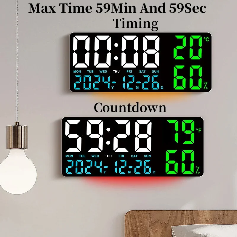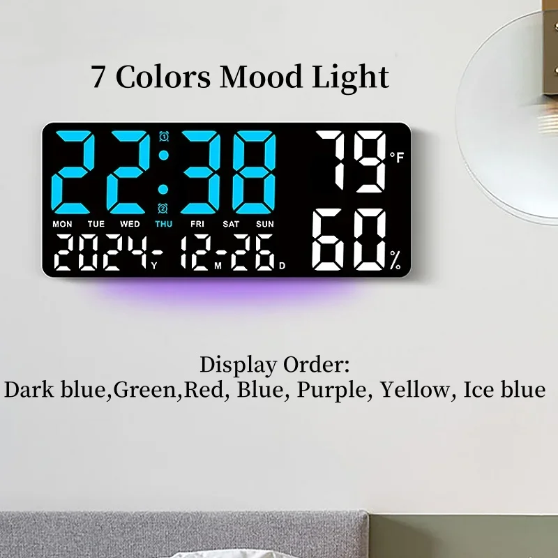Brighten up your space with this Large Digital Wall Clock featuring a 7-color mood light. It displays time, temperature, humidity, and date, and includes dual alarms, 12/24-hour format, and a countdown timer. Perfect for bedrooms, offices, or living rooms, its LED display is easy to read day or night. This multifunctional clock combines practicality with modern style, making it a great addition to any home or a thoughtful gift.