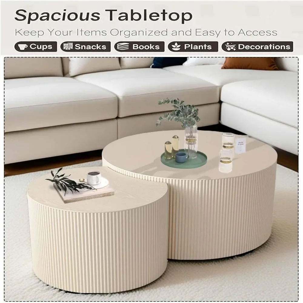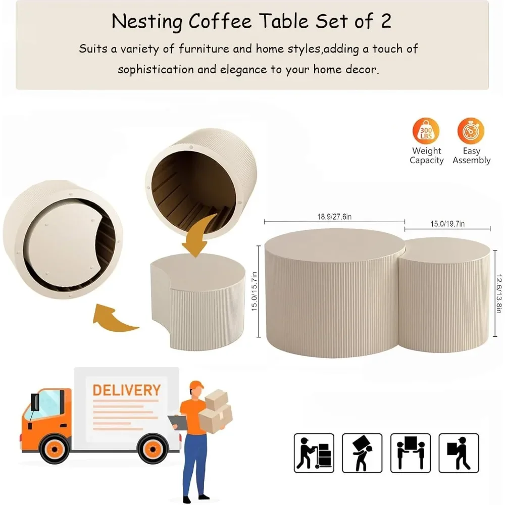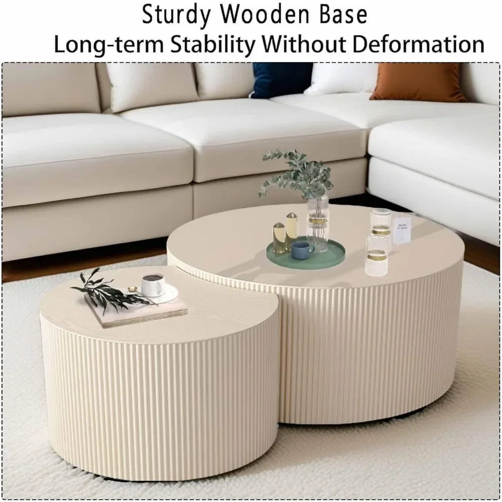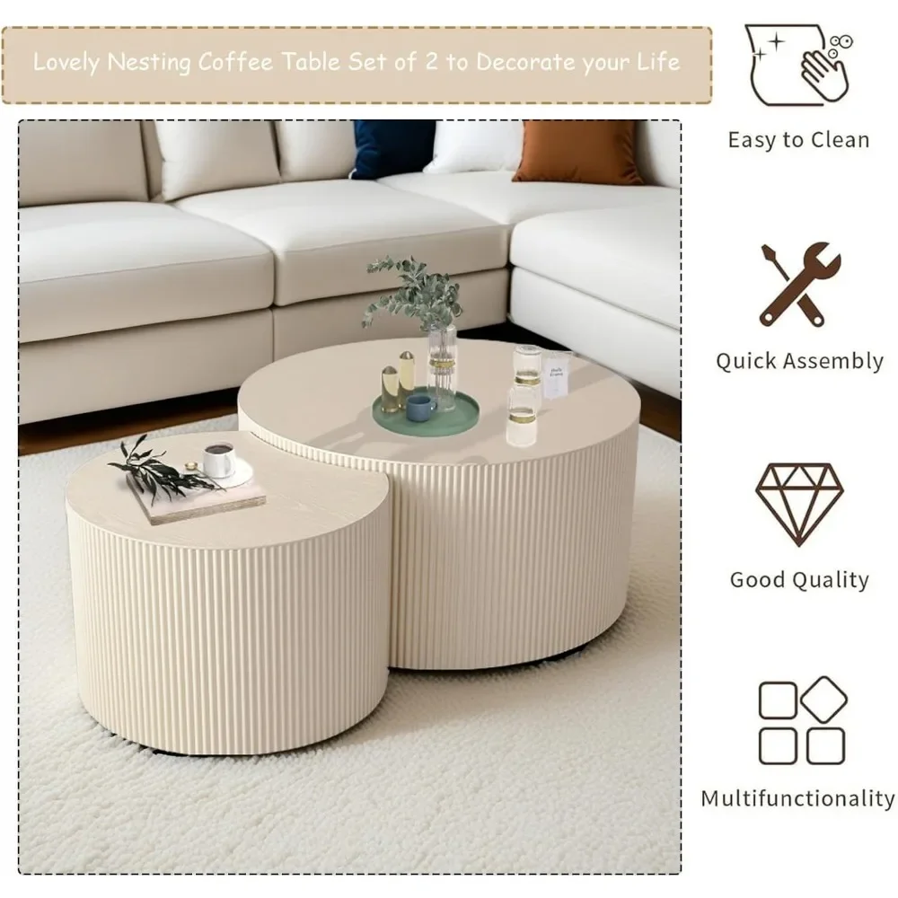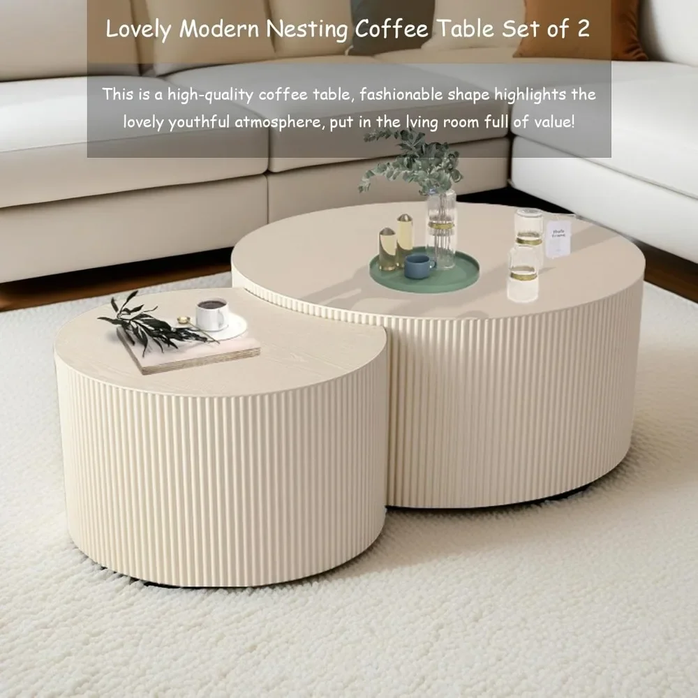 This modern round nesting coffee table set of 2 features a stylish drum design with elegant vertical stripe detailing. The set includes two tables that can be used together or separately as a coffee or side table. Perfect for contemporary living rooms, it offers a sleek look and space-saving functionality.