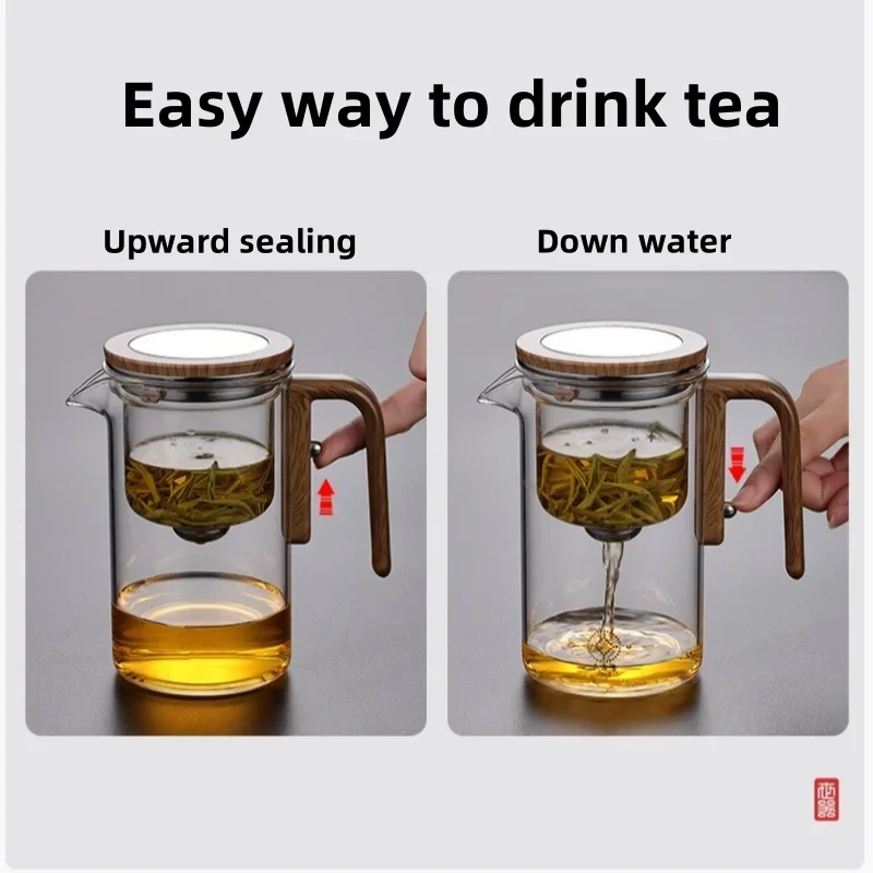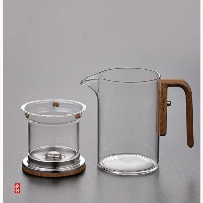 Heat-resistant glass teapot with wooden handle and one-click magnetic filter. Ideal for effortless Kung Fu tea brewing and precise filtration.