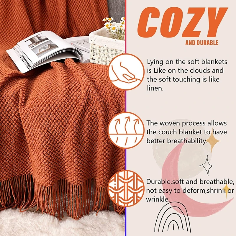 Add warmth and style to your home with this Orange Red Knitted Blanket. Featuring a classic cable knit design with tassels, it brings vintage charm and sophistication to any space. Perfect for sofas, beds, or couches, it doubles as a cozy throw and decorative accent. Made from high-quality materials, it’s soft, warm, and comfortable for everyday use. The vibrant orange-red color adds a pop of color to living rooms, bedrooms, or reading nooks. Its farmhouse-inspired design complements rustic, vintage, and modern interiors. Lightweight yet cozy, it’s ideal for snuggling during chilly evenings or relaxing with a book. The generous size fits most couches and beds, providing ample coverage. Makes a thoughtful gift for friends, family, or loved ones for holidays or special occasions. Elevate your home décor and stay cozy with this luxurious knitted blanket.