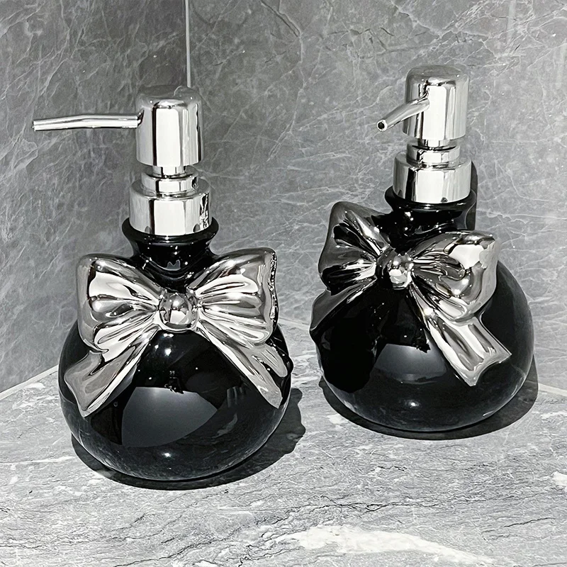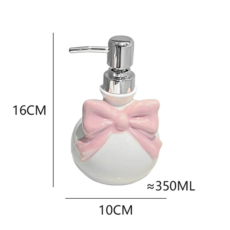 Refillable bow-shaped dispenser set with separate bottles for shampoo, conditioner, or liquid soap. Perfect for bathroom sinks and countertop organization. Durable and convenient.
