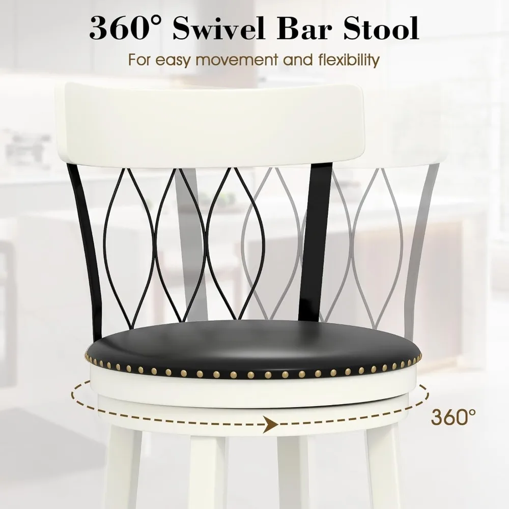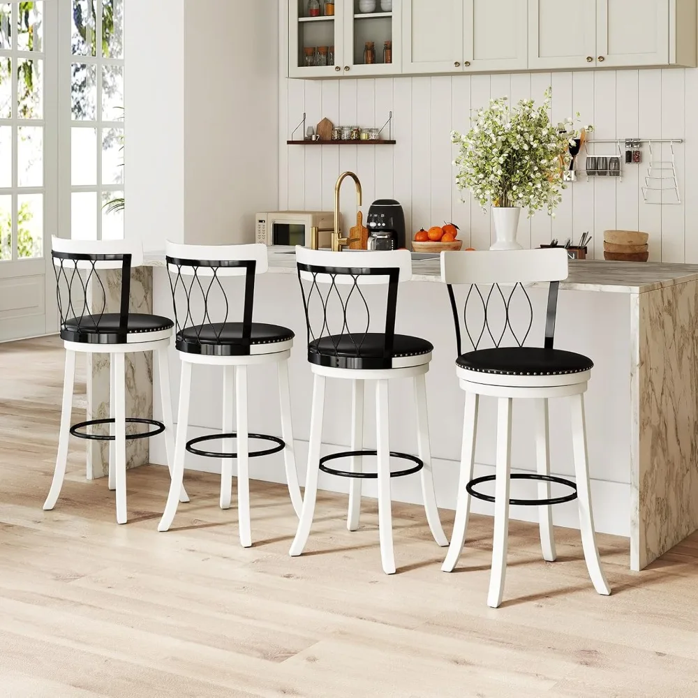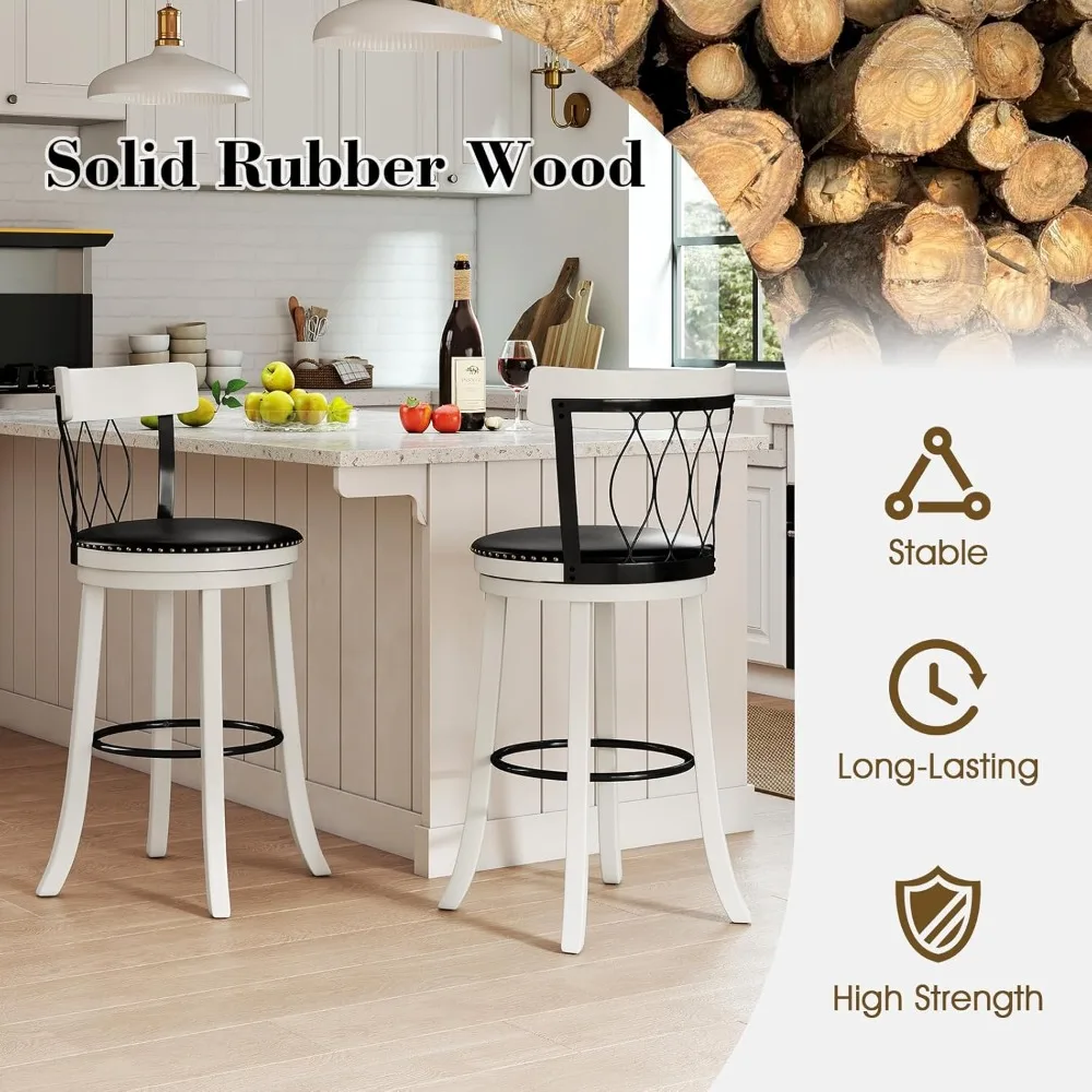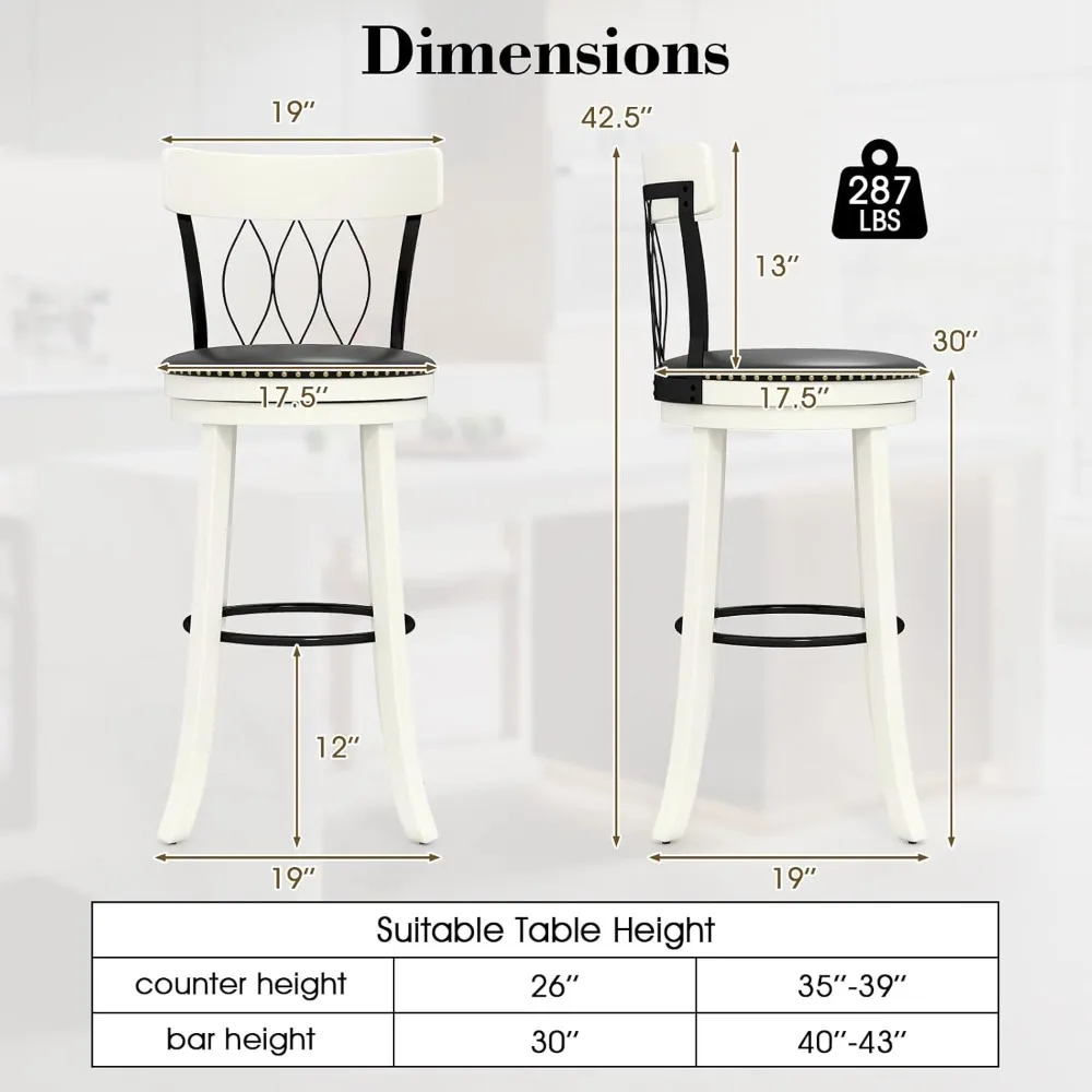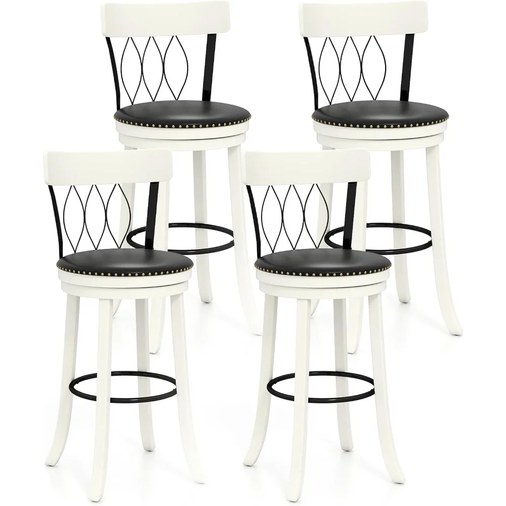Set of 4 swivel bar stools with 30″ seat height, ergonomic backrests, and soft cushioned seats for maximum comfort. Constructed with durable rubberwood and equipped with footrests, these bar-height stools are ideal for kitchens, home bars, or islands, combining style and functionality.