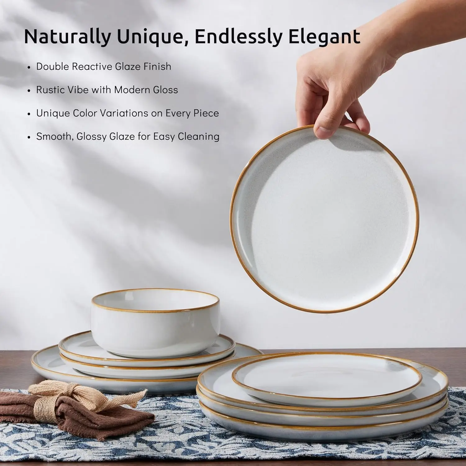 12-piece stoneware dinnerware set for 4, including plates and bowls with a durable reactive glaze finish. Safe for microwave and dishwasher use, perfect for everyday dining.