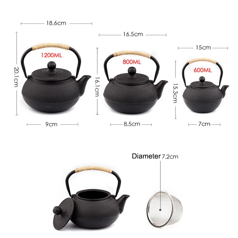 UPORS Japanese-style cast iron teapot with stainless steel infuser, ideal for boiling water and brewing oolong tea. Available in 600ml, 800ml, and 1200ml for home or tea ceremony use.